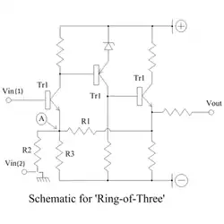 The circuitry in the 2001 was all solid state apart from the pick-up tubes and, in the early cameras, the first stage of the head amplifiers. The circuitry made extensive use of the 'ring-of-three' amplifier configuration, shown simplified in the figure. This circuit was easily adapted for various uses.