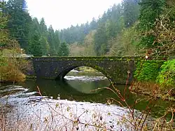 The Eagle Creek Bridge is a contributing structure in the Columbia River Highway Historic District, which was listed on the National Register of Historic Places in 1983. It is self-evidently a closed spandrel arch bridge.