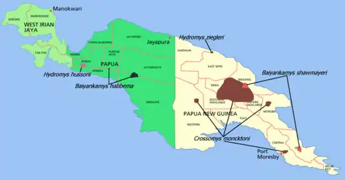 The earless water rat (Crossomys moncktoni) is a New Guinea rodent, part of the Hydromys group of the subfamily of Old World rats and mice (Murinae). It is the only species in the genus Crossomys. This species is probably most closely related to Baiyankamys.[2] It is still unclear to which species this group is related. It is one of the most aquatically adapted rodents of the world.[2]
