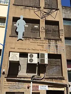 Burnett Lane is a narrow street that runs between George Street and Albert Street between and parallel to Adelaide Street and Queen Street. It is Brisbane's oldest laneway and is named after James Charles Burnett, one of Queensland's earliest surveyors.[11] During the penal colony years, it was used as a prison exercise yard and for floggings and hangings. Later it became the tradesmen's entrance to buildings fronting Queen and Adelaide Streets. In 2008 Brisbane City Council announced that Burnett Lane would be refurbished and integrated into the Queen Street Mall precinct, resulting in the lane developing into a popular cafe and bar precinct, but delivery vehicles pose a problem for pedestrians in this narrow street.[12][13]