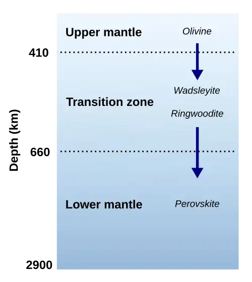 - the transition zone (approximately 410–660 km [250–410 mi]), in which wadsleyite (≈ 410–520 km [250–320 mi]) and ringwoodite (≈ 525–660 km [326–410 mi]) are stable