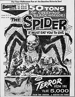 Earth vs. the Spider (a.k.a. The Spider) is an independently made 1958 American black-and-white science fiction horror film produced and directed by Bert I. Gordon, who also provided the plot upon which the screenplay by George Worthing Yates and Laszlo Gorog was based. Though the title suggests a global crisis, the film focuses entirely on a small town being terrorized by a giant spider. The film stars Ed Kemmer, June Kenney and Eugene Persson. The special effects were by Bert I. Gordon and Paul Blaisdell. Earth vs. the Spider was released by American International Pictures as a double feature in different film markets with either The Brain Eaters or The Screaming Skull.