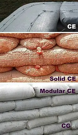 For hazardous locations, accurate terminology is needed. Contained earth (CE) is based on the original technique, but with specific soil strengths and reinforcement chosen for hazard levels. CE uses damp, cohesive, tamped bag fill, which bonds strongly with barbed wire and other reinforcement as the wall cures.