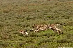 It usually eats medium-sized or large mammalian herbivores, such as antelopes. It preys on impala, Grant's gazelle, gerenuk, wildebeest, waterbuck, hare and guineafowl. It even feeds on other large mammals, such as plains zebras and ostriches on few occasions. Its favorite prey is the Thomson's gazelle. The gazelle is found mostly in savannas, grasslands and open fields of the Serengeti ecosystem of Tanzania and the Masai Mara ecosystem of Kenya, where the cheetah can chase and catch its prey at full speed.