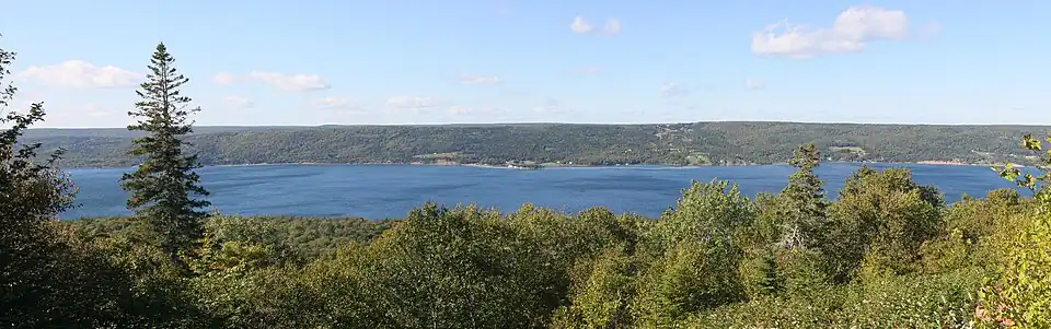 East Bay occupies a regional lowland that developed in soft Windsor Group rocks before the Quaternary glacial period. The main excavation of the deep channel (81–82 metres (266–269 ft)) in East Bay appears to be a consequence of glacial erosion, probably over hundreds of thousands of years through the Quaternary. The cliffs bordering the lake are unusual because they preserve organic sediments predating the last glaciation that provide a window on earlier environmental conditions.[3]