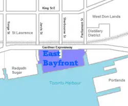 East Bayfront, or the East Bayfront Precinct, is an emerging neighbourhood in Toronto, Ontario, Canada. It is currently undergoing a transformation from industrial use to mixed-use as part of Waterfront Toronto's plans to create a residential and commercial district urban core near the lake.