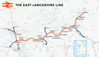 The East Lancashire line is a railway line in the Lancashire region of England, which runs between Preston and Colne, through Blackburn, Accrington, Burnley (Barracks and Central) and Nelson. The line formerly ran onto Skipton but this closed in 1970.