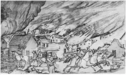 On May 21, Donaldson and Jones rode into town and arrested those who had evaded them. While the citizens of Lawrence hoped the officers would leave peacefully, this did not come to pass.[85] Donaldson dismissed his men, who Jomes immediately deputized. The sheriff was then joined by more followers and together they began to sack the city. After seizing the house of Charles Robinson (who had recently been arrested in Missouri, and was held in prison near Lecompton on grounds of treason)[36][86] to serve as his headquarters, Jones and his men attacked the offices of the antislavery newspapers. The attackers smashed the presses, tossed the type into the nearby Kansas River, and threw printed copies of the newspapers into the wind. Afterward, the proslavery mob shot the Free State Hotel with a cannon and burnt it down. Jones and his men then pillaged $30,000 worth of valuables. When Jones left the city, he and his men lit Robinson's house on fire for good measure.[85][87]