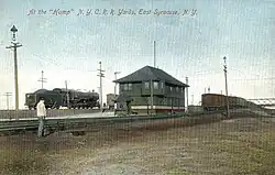 In the 1870s, the main line of the New York Central Railroad was built through the northern part of Messina. The DeWitt Railyards complex, one of the busiest in the world in its day, stretched from Messina five miles east to Minoa. East and westbound trains were assembled in the yards at the "Hump", where trains were pushed up tracks on one side of an artificial hill and routed to their train by track switches as the rolled freely down the far side. During most of the nineteenth century the larger part of the hamlet was south of the railroad yards, but as the population grew with rail workers, housing expanded to the north.