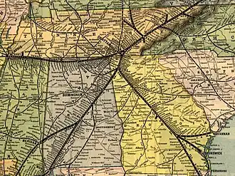 In 1869, the ETV&G bought the Knoxville and Kentucky Railroad, which had been revived after the war, and over the subsequent decade extended its tracks to the Kentucky state line at Jellico.[2] During this same period, the ETV&G acquired the Memphis and Charleston Railroad,[2] which connected Memphis and Chattanooga, the Georgia Southern Railroad, which connected Dalton with Rome, Georgia, and the Macon and Brunswick Railroad, which connected Macon, Georgia, with Brunswick, Georgia on the Atlantic Coast. By 1882, the ETV&G had completed tracks from Rome to Macon, connecting these last two lines.[5]