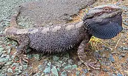 The eastern bearded dragon (Pogona barbata), also known as common bearded dragon or simply bearded lizard, is an agamid lizard found in wooded parts of Australia.[1][2][3] It is one of a group of species known commonly as bearded dragons. Other common names for this species include Jew lizard[1] and frilly lizard, the latter being a confusion between this and another dragon, the frill-necked lizard (Chlamydosaurus kingii). This species was originally described in 1829 by Georges Cuvier, who named it Amphibolurus barbatus.[4]