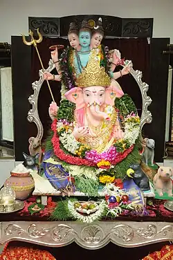 Lord Ganesha in Hindu is a God that is tasked to "remove obstacles", "patron of sciences and arts" as well as the "deva of wisdom and intelligence" as Dunn and Jensen (2019) claim.[20] The elephant often symbolises Ganesha as the ears represent and encourage greater listening, the small mouth promotes lesser talking, the big stomach associates with one's greater ability to digest the bad, neutral and good things in life, the little eyes with attentive concentration and the trunk for high efficiency and flexibility.[20] This becomes identifiable in business work ethics as people aim to resemble Lord Ganesha and his features.
