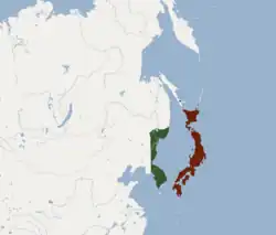 The eastern long-fingered bat is found in Russian Far East and East Asia, including China, Japan, North Korea, South Korea, and Russia.[1] Within its range, the eastern long-fingered bat is strongly associated with riparian habitat, as it forages for food over rivers.[5] During the day it roosts in rock crevices, human structures, and caves.[1]