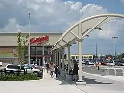 The Hamilton Street Railway bus terminal is located near the southeast corner of the mall, on the north side of Queenston Road just west of Centennial Parkway. There is a covered walkway connecting the terminal with the mall.[5] The terminal is notable in that it connects most of the community of Stoney Creek via route 55 with the rest of the HSR transit system. Originally located north of its current location and with its northernmost lane directly adjacent to the mall, it was redesigned and rebuilt in a new location slightly to the south, closer to Queenston Road, in the late 2000s.