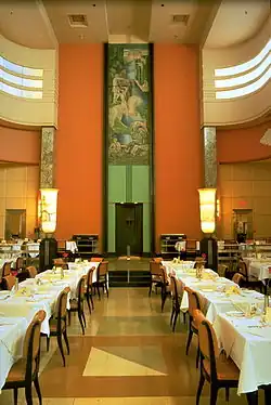 Lady Eaton, the wife of the multi-millionaire owner of the Eaton's department stores, gave her interpretation of "class and style" to the major Eaton's stores. In 1925 Eaton's purchased the three-storey Goodwin building[1] at 677 Saint Catherine Street West and commissioned architects Ross & MacDonald to build it up to six storeys in 1927. The top three floors were added in 1930–1931.[2] On January 26, 1931, Lady Eaton opened a large Art Deco restaurant on the 9th floor of the building. The restaurant was designed by architect Jacques Carlu, and[3] the floor-to-ceiling mural at the back of the restaurant was created by his wife Natacha Carlu.[4] It was patterned on dining hall of the transatlantic liner SS Île de France. The 9th floor corridor between the elevators and restaurant is also in the Art Deco style.