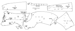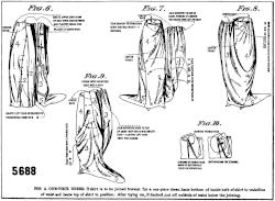 Facsimile of the pattern pieces for Butterick pattern #5688 (a skirt for an evening dress), circa 1919. Darts, stitching lines, etc. are indicated by perforations of different sizes and patterns (here represented as dots).
