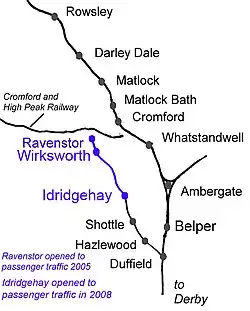 Wirksworth station was reopened in 2002, with the first 1⁄2 mile (0.80 km) of line between Wirksworth and Gorsey Bank reopened for a DMU shuttle passenger service in 2004, followed by a new line to Ravenstor in 2005.[6] On 8 March 2008, the railway began to branch its passenger operations further south by holding a grand opening ceremony[7] for the line between Wirksworth and Idridgehay[8] – 3+1⁄2 miles (5.6 km) of the line's total length.