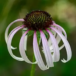 It flowers from late spring to early summer at low altitudes 0–200 m (0–656 ft).[3] Each stem has one rose-pink to pale purple flower head, up to 5 cm (2 in) long and 12 mm (½ in) wide, with 10–20 ray flowers that conspicuously droop.[3] The 2.5 cm (1 in) cone-shaped center containing the disc florets is purplish-brown on the outside and greenish toward the center.[5]