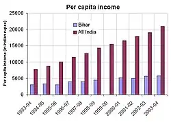 In the non-agricultural sector, the growth rate in Bihar was 6.62% against 6.61% for India as a whole during the 1980s. During the 1990s when the growth rate in Bihar was 3.19%, while for India it rose to 7.25%. This change was reflected in the per capita income as well. Per capita income in Bihar grew by 2.45% during the 1980s, against 3.32% per cent in India as a whole. In the 1990s, per capita income grew by 0.12% per cent in Bihar, as against 4.08% per cent in India. The growth rate in agriculture was 2.21% during the 1980s against India's 3.38%, during the 1990s it was 2.35% in Bihar while at the all-India it stood at 3.14%.[28] The economic indicators (see below) shows that there was a serious recession between 1990 and 1995, which resulted in an employment-development-crime crisis between 1995 and 2004.