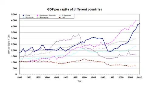 Before the Cuban Revolution, in 1958, Cuba had a per-capita GDP of $2,363, which placed it in the middle of Latin American countries at the time.[30] According to the UN, between 1950 and 1955, Cuba had a life expectancy of 59.4 years, which placed it in 56th place in the global ranking.[31]
