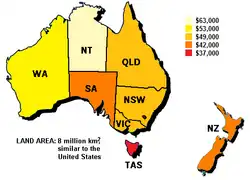 The average weekly earnings for a full-time adult person in Queensland in 2009 was $1,177.00.[54] While Queensland generally does not have high cost of living, housing is expensive compared to other states. Housing in Queensland is the least affordable of any state or territory.[55] The average Queensland homeowner had to pay 40.5% of their household income towards home loan repayments and tenants on average paid 26.5% for rent during the first quarter of 2008.[55] Average wages rose by 7.5% in 2009, three times the national inflation rate.[56]