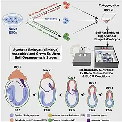 - ^ Tarazi, Shadi; Aguilera-Castrejon, Alejandro; Joubran, Carine; Ghanem, Nadir; Ashouokhi, Shahd; Roncato, Francesco; Wildschutz, Emilie; Haddad, Montaser; Oldak, Bernardo; Gomez-Cesar, Elidet; Livnat, Nir; Viukov, Sergey; Lokshtanov, Dmitry; Naveh-Tassa, Segev; Rose, Max (1 August 2022). "Post-gastrulation synthetic embryos generated ex utero from mouse naive ESCs". Cell. 185 (18): 3290–3306.e25. doi:10.1016/j.cell.2022.07.028. ISSN 1097-4172. PMC 9439721. PMID 35988542.