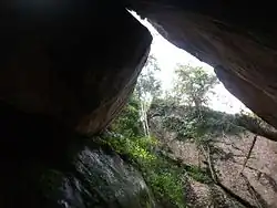The Edakkal caves are two natural caves at a remote location in sultan bathery in the Wayanad district of Kerala in India. They lie 1,200 m (3,900 ft) above sea level on Ambukutty Mala, near an ancient trade route connecting the high mountains of Mysore to the ports of the Malabar Coast. Inside the caves are paintings believed to date to at least 6,000 BCE,[1][2] from the Neolithic man, indicating the presence of a prehistoric settlement in this region.[3] The Stone Age carvings of Edakkal are rare and are the only known examples from South India besides those of Shenthurini, Kollam, also in Kerala.[4] The cave paintings of Shenthurini (Shendurney) forests in Kerala are of the Mesolithic era (middle stone-age).