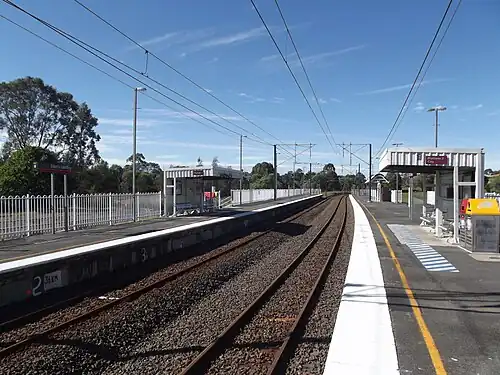 Platform 1 is located on the northern side, while platform 2 is located on the southern side of the station.[1] Eddy Avenue is located on the southern side, where the car park is located.[1] This side of the station also consists of a drop off zone, a ticket machine, and bike storage for commuters.[1]