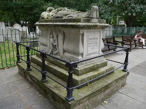 Meanwhile, he continued to exhibit, chiefly busts, statuettes, and sketch designs, sent from his studio in Seymour Street, St Pancras. The most popular of his ideal works were "Adam and Eve", executed for Mr Foster-White, treasurer to St Bartholomew's Hospital; "The Woman of Samaria", for Mr James Brand; and (1856) "The Moabitish Maiden", a commission from Albert, the Prince Consort. Among the numerous busts of eminent men he executed those of John Hanning Speke, of Sir Richard Burton, and of Admiral Robert Blake, erected in the shire hall in Taunton. In 1862 he was responsible for the restoration and remodelling of the tomb of John Bunyan in Bunhill Fields, London. In the competition of June and July 1857 for a monument to the Duke of Wellington in St Paul's Cathedral his model received the third prize of £300, out of eighty-three designs submitted; that by Alfred Stevens (the design eventually installed) was one of the five receiving £100 each.[1]