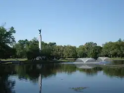 The most prominent feature of the park is the pond and the small island with the World War I memorial on it. Edgemont Park is known for its World War I memorial, which is one of the landmarks of Montclair. The main memorial, created in 1924 by Charles Keck, is a tall obelisk with bronze sculptures of Winged Victory on top and the Billy Boys on the bottom. On the sides of the obelisk are etched the names of those who fell in the First World War, to whom the monument is dedicated. In front of the memorial there are small plaques that have the names of those who died in the Vietnam War and Korean War and World War II.[3]
