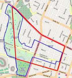 The district's most notable topographical feature is the West River, which runs through Edgewood Park in the eastern end of the district on a north-south axis. From the West River, the landscape rapidly rises about forty feet to Yale Avenue on the west. Edgewood Park also includes memorials for the Spanish–American War and the Holocaust. The park's current layout was designed in 1910 by Frederick Law Olmsted Jr.[3] The district includes the central portion of the Edgewood neighborhood, which is generally the area bounded by Whalley Avenue, Sherman Avenue, Chapel Street, and Edgewood Park. The district also borders the Dwight Street Historic District on the east.[2]