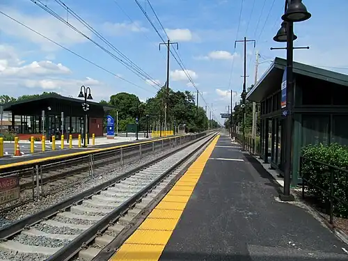 Edgewood station platform, looking northbound in 2014. The station building is at left and the smaller northbound shelter at right. | |||||||||||||||||||||||