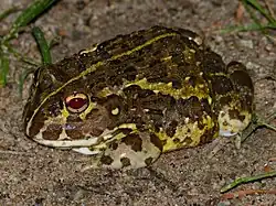 The edible bullfrog (Pyxicephalus edulis), also known as the pixie frog, lesser bullfrog or Peter's bullfrog,[2] is a large-bodied African species of frog in the family Pyxicephalidae.