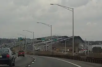 The Edison Bridge (officially the Thomas Alva Edison Memorial Bridge) and the Vieser bridge (officially the Ellis S. Vieser Memorial Bridge) are a pair of bridges that carry U.S. Route 9 in the state of New Jersey, spanning the Raritan River near its mouth in Raritan Bay. The bridge, which connects Woodbridge on the north with Sayreville on the south, was opened to weekend traffic starting on October 11, 1940, and was opened permanently on November 15, 1940.[1] As of 2003, the bridge carries more than 82,000 vehicles daily and is owned and operated by the New Jersey Department of Transportation. It also runs directly parallel to the Driscoll Bridge, which carries the Garden State Parkway.