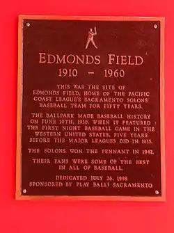 Edmonds Field was home to the Sacramento Solons, the Pacific Coast League AAA team from 1910 through 1960, after which they moved to Hawaii. The field was located at the southeast corner of Broadway (originally Y Street) to the north (third base); Riverside Boulevard (originally 11th Street) to the west (first base); and First Avenue to the south (right field).