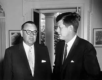 Brown's first term as governor was very successful, but failings on important matters to him were costly. Agriculture and special interests defeated his best efforts to pass a $1.25 per hour minimum wage, and Brown's opposition to capital punishment was overruled by the practice being supported statewide. Brown was a supporter of Senator John F. Kennedy in the 1960 presidential election, but Brown's California delegation to the Democratic National Convention did not abide by his support for Kennedy, which nearly cost Kennedy the nomination. Brown's opponent in 1962 was former Vice President Richard Nixon. Having narrowly lost the presidency to Kennedy in 1960, Nixon was not interested in the governorship of his native California other than as a path to the White House.[8] Unfamiliar with California politics and matters, Nixon resorted to accusing Brown of 'softness' against communism, which was not a successful platform. In the November 1962 election, Brown was reelected, by 296,758 votes, whereupon Nixon famously held his self-proclaimed "last press conference" (he would eventually become president in 1969).