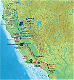 With his administration beginning in 1959, Brown set in motion a series of actions whose magnitude was unseen since the governorship of Hiram Johnson.[8] The post–World War II economic expansion brought millions of newcomers to the state which, along with the state's cyclical droughts, severely strained California's water resources, especially in dry Southern California. This began the California State Water Project, whose objective was to address the fact that one half of the state's people lived in a region containing one percent of the state's natural supply of water.[8] Much of the state's extant water was controlled by regional bodies, and the federal government. These federally controlled areas were under the jurisdiction of the Bureau of Reclamation, which was considering the implementation of a "160-acre principle", a policy contained within the Newlands Reclamation Act of 1902, limiting delivery of federally subsidized water to parcels equal to the size of a homestead, which was 160 acres. This brought strong opposition from the agricultural industry, and as such would require significant splintering of existent land holdings. To relieve this threat to the agricultural economy, Brown and other state leaders began the State Water Project, whose master plan included a vast system of reservoirs, aqueducts, and pipelines powered by pump stations and electrical generating plants to transport the water statewide. This included the capture of the Sacramento River runoff, redirecting the seabound water through the San Joaquin Valley, not only irrigating the arid desert regions, but also providing Southern California, particularly Los Angeles County, with the water required to sustain expansions in population and industry.[8] The entire project was projected to take sixty years, costing $13 billion, nearly $104 billion in 2015 dollars.[16]