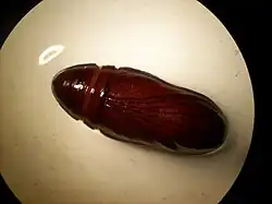 Mating is driven by pheromones emitted by either female or male individuals.[9] The eggs are internally fertilized by male sperm, which enters the eggs through a small pore called the micropyle.[9] Females in the Edosa genus have an apomorphic trait in which their abdominal segments are invaginated to form pockets that contain fine, silky hairs, called a corethrogyne, which attach a protective fluff to the eggs to defend them from parasites.[3]