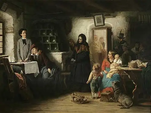Friends came to his assistance, but it wasn't until 1867 that he achieved some success with his painting "The Storyteller". This helped him obtain a position in the studios of Karl von Piloty in Munich, where he worked for two years.[2] His associates there included Hans Makart and Franz Defregger. Afterwards, he continued to study independently and scored his first major success in 1870 with his genre painting Die ereilten Flüchtlinge (The Refugees, Overtaken), which was purchased for the gallery of the Schloss Belvedere.[1] This sale, the commissions that followed and the fees from several students enabled him to take a long-desired study trip to Rome and Naples.