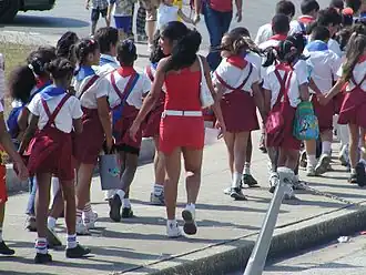 School attendance is compulsory from ages 6 to 15 or 16 (end of basic secondary education) and all students, regardless of age or sex, wear school uniforms with the color denoting grade level. Primary education lasts for six years. It consists of grades 1 through 6. Secondary education is divided into basic secondary education and pre-university secondary education. The curriculum in primary and secondary schools is based upon principles of "hard work, self-discipline and love of country". The primary-school curriculum includes dance and gardening, lessons on health and hygiene, and Cuban revolutionary history.[5] At the end of basic secondary education, pupils can choose between pre-university education and technical and professional education. Those who complete pre-university education are awarded the Bachillerato. Technical training leads to two levels of qualification - skilled worker and middle-level technician. Successful completion of this cycle gives access to the technological institutes.[25]