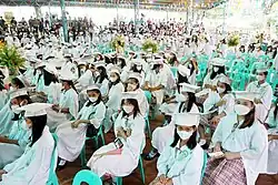 During the Japanese occupation, education indoctrinated the public to inculcate Japanese ideologies, causing low enrollment rates.[42] The Japanese Military Administration's Order No. February 2, 17, 1942, had six basic points: the propagation of Filipino culture; the dissemination of the principle of the Greater East Asia Co-Prosperity Sphere; the spiritual rejuvenation of the Filipinos; the teaching and propagation of Nippongo; the diffusion of vocational and elementary education; and "the promotion of the love of labour".[43][42]