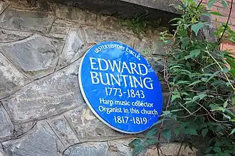 Bunting went on a number of collecting tours between 1792 and 1807, and was the first to transcribe music 'in the field' as played by the musicians. He realised the importance of the Irish words to the songs and Patrick Lynch was employed to collect these. Bunting, who lived in Belfast with the McCrackens until his marriage in 1819, moved to Dublin where he held the post of organist at St. Stephen's Church and taught music.[3] He died in Dublin on 21 December 1843 and is buried at the Cemetery of Mount Jerome, Dublin.[1]