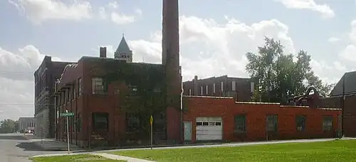 The Cox building lasted over 100 years —it was demolished April 26, 2016.[35] The building was part of Hartford City's Courthouse Square Historic District. The photo herein displays the Cox Building from the Franklin Street dock side. The front (Jefferson Street) entrance is to the left in the photo. Hartford City's two buildings that are part of the National Register of Historic Places are located close by. The back of the First Presbyterian Church is visible on the right side of the photo to the right of the alley, and the Blackford County Courthouse steeple can be seen at the top of the photo to the left of the Cox Building's smokestack.