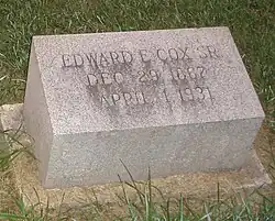 - ^ The birth year could possibly be 1868. Roll and Cox's gravestone say 1867. The 1870 U.S. Census says he was 2 on his birthday before August 1870, agreeing with December 29, 1867. Shinn (p. 528) says 1868, as does Hartford City Illustrated and the Hartford City News Cox obituary. The U.S. Census for 1930 implies that Cox's birth year is 1868, saying he was 61 years old on April 12, 1930.