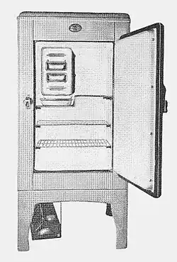Yet another early, imported, kerosene-powered refrigeration device was the "Gnome ice producer"—its original German brand name was "Gnom"[49]—which was on sale in Australia, by June 1926,[50] even before the Crosley Icy Ball U.S. patent had been filed. Essentially, its operating procedure was the same as an Icy Ball.[51] From around late 1927—possibly as early as June 1926—a more advanced kerosene-powered model, with an upright cabinet, referred to as a "Gnome refrigerator" was on sale,[50][52][53] until at least 1931; its semi-automatic operating procedure was similar to Hallstrom's later 1934 model.[54]
