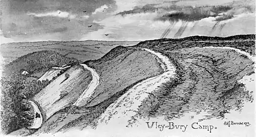 Uley Bury, an illustration by Burrow from"The Ancient Entrenchments and Camps of Gloucestershire published in 1919