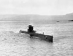 On 23 March 1941, Young was posted to the submarine HMS Umpire, and was promoted to lieutenant on 12 April.[11] Umpire was a new boat still undergoing commissioning trials on the River Medway. On commissioning, the boat was ordered to join Third Submarine Flotilla at Dunoon. Attached to a north bound convoy, Umpire developed an engine problem and fell slightly behind the convoy. In the dark night of 19/20 July 1941 the boat was not seen by Peter Hendriks, an armed trawler escorting a south bound convoy, and the two ships collided. Umpire sank almost immediately. Young was not on duty at the time and after the collision found himself in a flooding boat resting on the bottom of the North Sea in 80 feet (24.4 m) of water. Having tried to surface the boat using compressed air and having searched for other survivors, Young ended up in the conning tower with the First Lieutenant, an Engine Room Artificer (ERA) and an able seaman. They estimated that as a result of the angle of the boat and the height of the conning tower there was only about 45 feet (13.7 m) above them and that they should attempt to swim to the surface. Closing the hatch below them, they forced open the upper hatch and escaped.[12] The ERA was never seen again and the First Lieutenant drowned after reaching the surface. Young and the seaman were picked up together with several men who had escaped through the engine room hatch. The Commanding Officer, Lt M Wingfield, had already been rescued, having been on the bridge when the collision occurred. All told 2 officers and 20 ratings died with only 2 officers, Young and Wingfield, and 14 ratings surviving.[2] These figures appear in Young's account but the official record shows that there 16 lost and 17 survivors.[13]