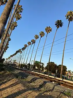 The park sits at the corner of Centinela Avenue and Florence Avenue. The K Line (Los Angeles Metro) tracks border the park; the Yellow Cars used the same right-of-way in the first half of the 20th century.