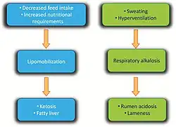 Cattle are suspectible to some specific heat stress risks, such as ruminal acidosis. Cattle eat less when they experience acute heat stress during hottest parts of the day, only to compensate when it is cooler, and this disbalance soon causes acidosis, which can lead to laminitis. Additionally, one of the ways cattle can attempt to deal with higher temperatures is by panting more often, which rapidly decreases carbon dioxide concentrations and increases pH. To avoid respiratory alkalosis, cattle are forced to shed bicarbonate through urination, and this comes at the expense of rumen buffering. These two pathologies can both develop into lameness, defined as "any foot abnormality that causes an animal to change the way that it walks". This effect can occur "weeks to months" after severe heat stress exposure, alongside sore ulcers and white line disease.[2] Another specific risk is mastitis, normally caused by either an injury to cow's udder, or "immune response to bacterial invasion of the teat canal."[2] Bovine neutrophil function is impaired at higher temperatures, leaving mammary glands more vulnerable to infection,[60] and mastitis is already known to be more prevalent during the summer months, so there is an expectation this would worsen with continued climate change.[2]