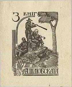 The bookplate made for Shlyubsky is characterized by its bare ethnography. In its center is a mound. An old peasant is sitting on the left side of the mound playing the dulcimer. An old man also sits on the mound and plays the bagpipe. Next to him, another old man in a straw hat is standing and playing the trumpet. The National Assembly of Shlyubsky was pleased to find in these bookplates of Minin's works vivid impressions of the Belarusian national revival.[1]